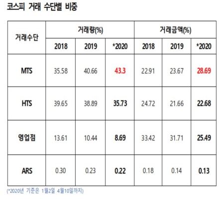 코스피 시장 내 MTS 거래 비중은 지난 2018년까지만 해도 35.58% 수준으로 HTS(39.65%)에 비해 4.07%p 가량 낮았다. 하지만 지난해 40.66%까지 늘어나 HTS(38.89%) 아성을 처음으로 넘어섰다.