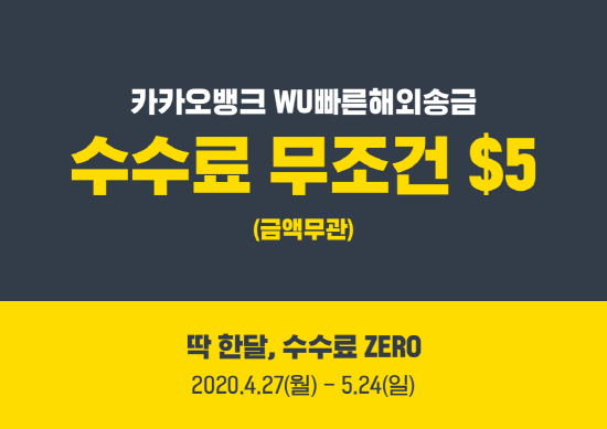 한국카카오은행은 'WU빠른해외송금' 비용을 송금액과 상관없이 5달러로 인하했다고 20일 밝혔다. 기존에는 3000달러 미만은 6달러, 초과시에는 12달러였다.