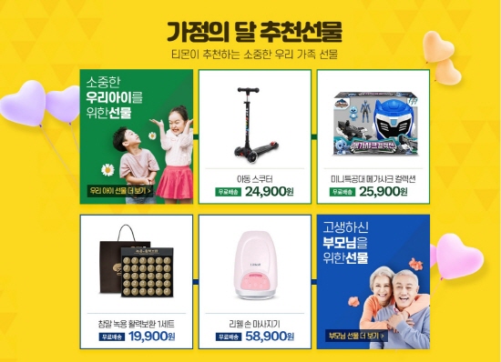이에 티몬은 '가정의 달 선물' 기획전을 내달 15일까지 진행하고 매일 50여개 내외의 상품을 선별해 최대 75%까지 할인 판매한다. 국민, 농협, 하나카드를 이용할 경우 전체 고객에게 해당 기획전에서 5만원이상 구매 시 사용 가능한 5000원 할인쿠폰을 지급한다. 슈퍼세이브 회원이라면 5만원 이상 구매 시 15%(최대 3만원) 할인쿠폰을 추가로 받을 수 있다.
