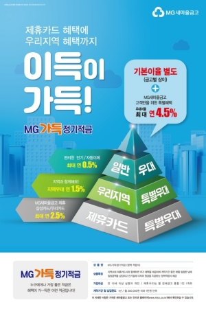 새마을금고는 삼성·우리카드와 제휴해 우대금리를 최고 연 4.5%까지 주는 'MG가득정기적금' 상품을 이날 출시한다. 새마을금고는 기본 이율이 지역 금고별로 다른데 일반적인 정기적금 상품의 경우 기본금리가 연 1~2%대다.
