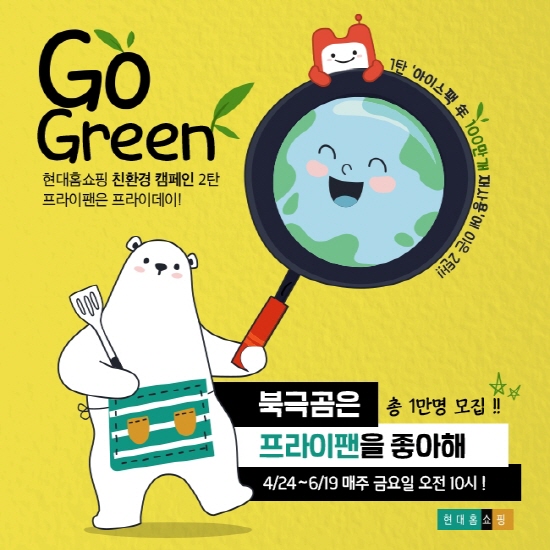 현대홈쇼핑은 오는 24일부터 10주간 일반 가정에서 사용하지 못하는 프라이팬을 직접 수거해 재활용하는 '북극곰은 프라이팬을 좋아해' 캠페인을 유통업계 최초로 진행한다고 23일 밝혔다.