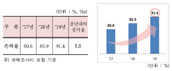 발생손해액을 경과보험료로 나눈 비율인 손해율은 더 나빠졌다. 경과보험료는 전년대비 2.4% 증가한 16조1000억원인 반면 손해액은 8.6% 증가한 14조7000억원이어서다. 손해율 악화는 보험료의 인상 요인으로 작용한다.