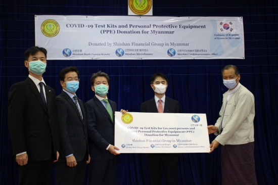 신한금융그룹은 25일 미얀마 양곤의학연구소에서 국내 바이오기업인 '씨젠'과 함께 미얀마 보건체육부에 코로나 19 진단키트 1만명분과 방호복 300벌을 기부했다.