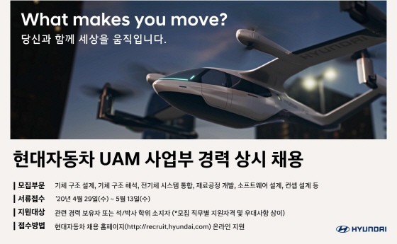 현대자동차가 UAM(Urban Air Mobility : 도심 항공 모빌리티) 기술 개발을 위해 인재 채용에 나선다.