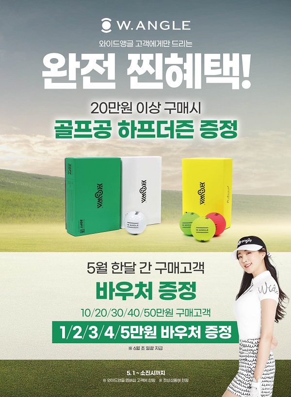 와이드앵글은 오는 31일까지 전국 백화점 및 대리점(아울렛 포함)에서 20만 원 이상 구매 멤버십 고객에게 골프공 하프더즌(6구)을 선착순 무료 증정한다. 10만 원, 20만 원, 30만 원, 40만 원, 50만 원 이상 구매한 멤버십 고객에게는 1만 원, 2만 원, 3만 원, 4만 원, 5만 원 바우처를 각각 증정한다.