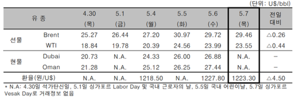 유럽거래소(ICE)의 브렌트유(Brent)는 전일 대비 배럴당 0.26달러 빠진 29.46달러로 장을 마감했다. 중동 두바이유(Dubai)는 싱가포르 공휴일로 거래되지 않았다.