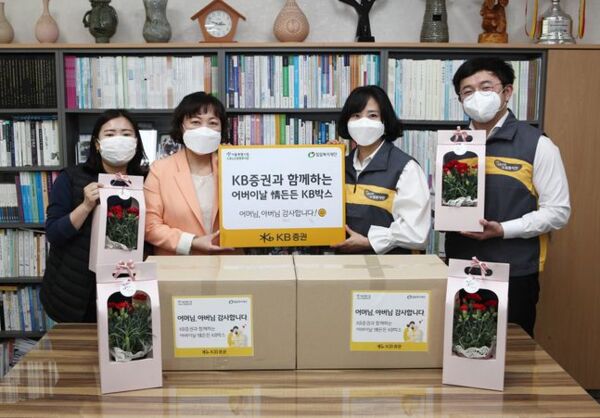 지난 7일 KB증권 임직원은 도봉노인종합복지관을 방문해 지역 어르신들께 정성스레 담은 식료품과 카네이션을 전달했다. KB증권은 올해로 6년째 매년 어버이날마다 감사한 마음을 담아 카네이션과 식료품을 저소득 가정 어르신들께 전달하고 있다.