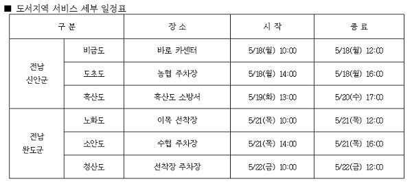 여름철 운행을 앞두고 △타이어 마모 상태 점검 및 에어컨 필터 점검을 비롯해 도서지역 차량 관리 전반에 대한 정비상담 서비스도 실시한다.
