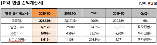 전년 동기대비 매출액은 20% 감소했지만, 영업이익과 당기순이익은 각각 114%, 226% 증가했다. 전 분기대비로는 매출이 1.9% 감소했고 영업이익과 당기순이익은 흑자전환했다.