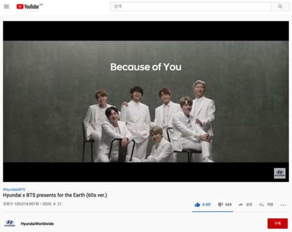 현대차는 지난 1월부터 방탄소년단과 함께 'Because of You'라는 슬로건 아래 미래 청정에너지 '수소'의 친환경성과 지속가능성을 전파하는 '글로벌 수소 캠페인'을 진행하고 있다.