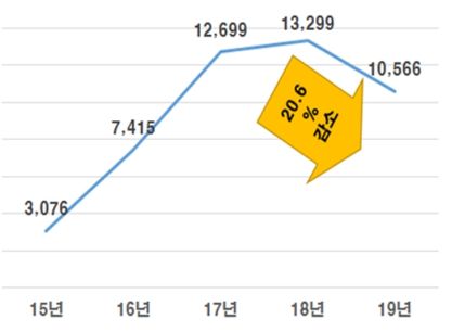 2015년 이후 증가세를 이어오던 국내 외국인 직접투자가 2019년 전년대비 20.6% 감소한 105억7000만 달러를 나타냈다.