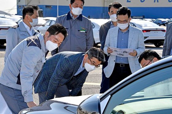 송호성 사장은 이날 수출 차량의 내외관 및 배터리, 타이어 상태 등을 꼼꼼히 살피고 현장의 직원들에게 철저한 품질 점검을 당부했다.