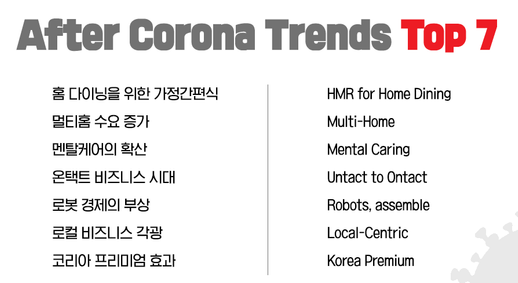 코로나 이후 소비 트렌드 키워드는 ▲홈다이닝을 위한 가정간편식 ▲멀티홈 수요 증가 ▲멘탈 케어의 확산 ▲온택트 비즈니스 시대 ▲로봇 경제의 부상 ▲로컬 비즈니스 각광 ▲코리아 프리미엄 효과를 꼽았다.