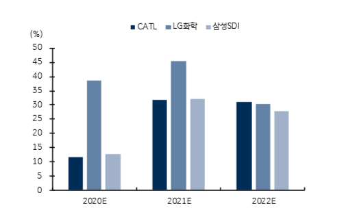KB증권 조사에 따르면 2021년 CATL 매출액 성장률은 30%를 상회할 전망이다. CATL은 글로벌 배터리 점유율에서 최근 2년간 1위 자리를 지켜왔다.
