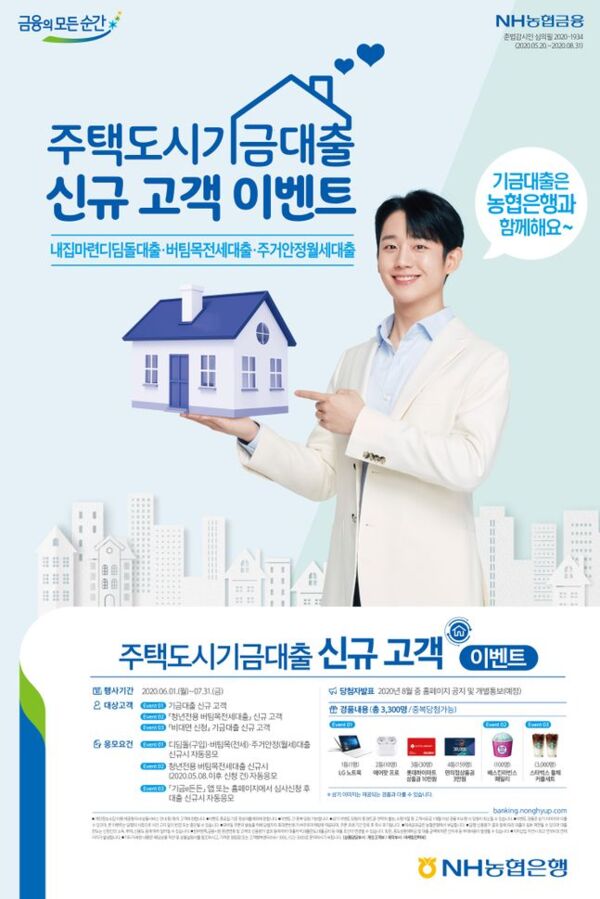 이벤트 기간 중 농협은행에서 주택도시기금대출(내집마련디딤돌대출·버팀목전세대출·주거안정월세대출) 신규 고객 대상으로 총 3300명을 추첨하여 LG노트북(1명), 에어팟프로(10명), 롯데하이마트상품권(30명), 편의점상품권(159명) 등 푸짐한 경품을 제공한다.