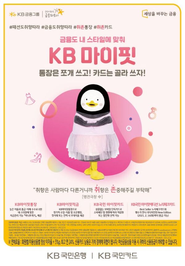 'KB마이핏 패키지' 내 KB국민카드 상품은 소비 취향에 따라 적립형과 할인형 선택이 가능한'KB국민 마이핏카드' 및 펭수와 KB국민노리체크카드가 만나 리디자인된 'KB국민 마이핏 에디션 노리 체크카드(펭요미)'가 있다.