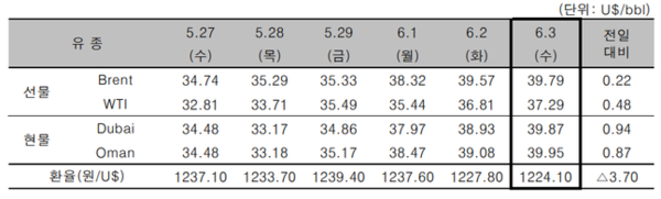 유럽거래소(ICE)의 브렌트유(Brent)는 전일 대비 배럴당 0.22달러 상승한 39.79달러로 장을 마감했다.
