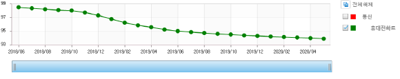 실제 한국은행의 소비자물가지수에 따르면 지난달 휴대전화료 물가지수는 93.92로 역대 최저치를 기록했다. 소비자물가지수는 100을 기준으로 이 보다 높으면 상승, 낮으면 하락이다. 2017년 10월(99.92)부터 지속 감소하며 100 이하를 기록하고 있다. 이는 2017년 시행된 선택약정할인율 상향과 데이터 무제한 요금제 출시 등 요금인하 정책이 효과를 거두고 있는 것으로 업계는 분석한다.
