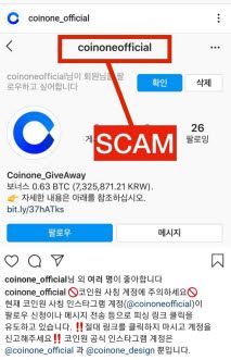 최근 업계 내 스캠 수법은 방법이 한층 교묘해지고 있다. 거래소 공식 이미지(CI)를 계정의 프로필 사진으로 지정해 놓는다거나 계정을 한 글자씩 바꾸는 방식으로 투자자들의 혼란을 부추기고 있다. 실제로 코인원이 운영하는 공식 인스타그램 계정 주소는 coinone_official과 coinone_design 이지만, 사칭 스캠은 'coinoneofficial'을 계정 주소로 사용하고 있다.