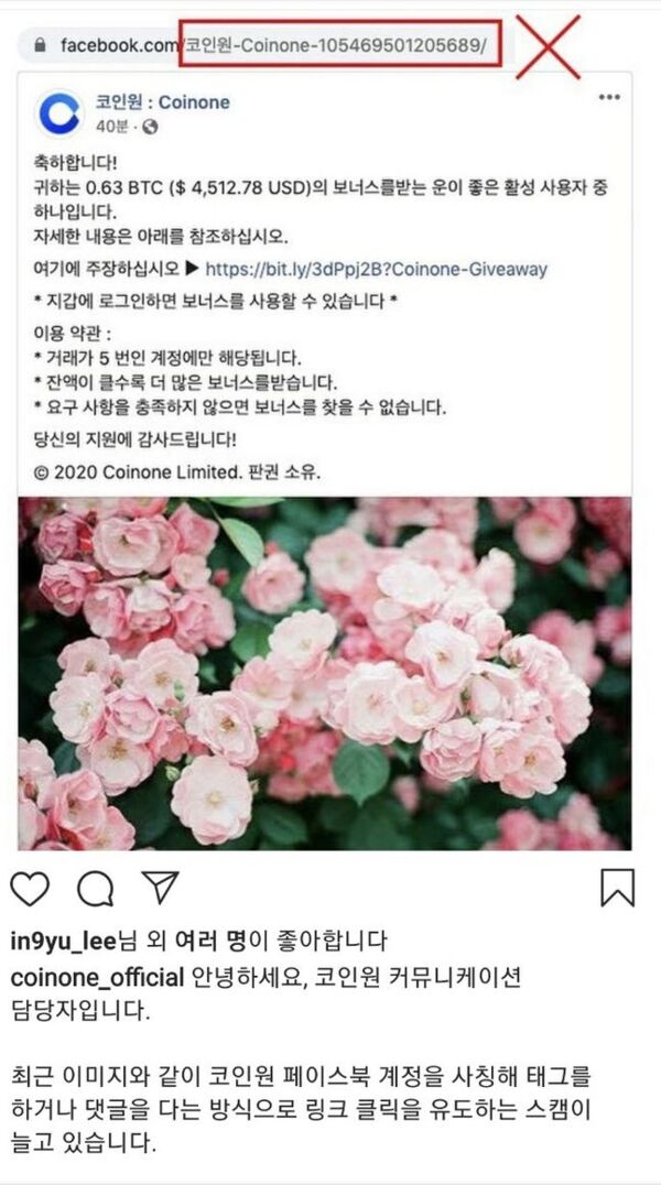 코인원은 "코인원 페이스북 계정을 사칭해 태그를 하거나 댓글을 다는 방식으로 링크 클릭을 유도하는 스캠이 늘어나고 있다"며 "코인원 공식 페이스북 계정은 사용자를 태그 하는 형식의 이벤트를 절대 진행하지 않는다"고 당부했다.