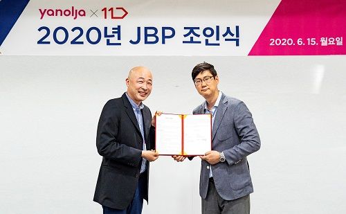 지난 15일 오후 서울 강남구 야놀자 본사에서 11번가 김성수 생활플러스 담당과 야놀자 신성철 사업개발실장이 각 사 대표로 참석해 전략적 비즈니스 파트너십(JBP)을 맺었다.