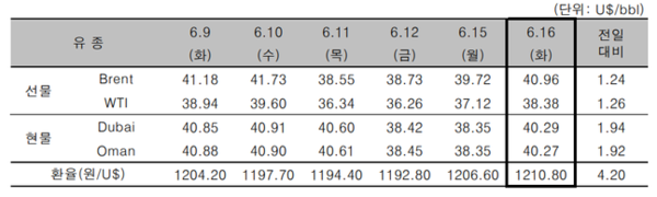 유럽거래소(ICE)의 브렌트유(Brent)는 전일 대비 배럴당 1.24달러 상승한 40.96달러로 장을 마감했다.