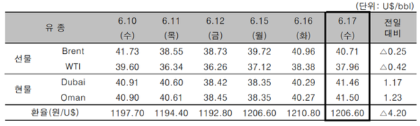 중동 두바이유(Dubai)는 전일 대비 배럴당 1.17달러 오른 41.46달러로 나타났다.