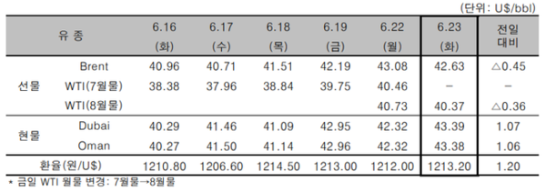유럽거래소(ICE)의 브렌트유(Brent) 가격은 전일 대비 배럴당 0.45달러 빠진 42.63달러로 마감했다.