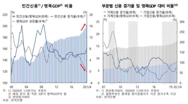 24일 한국은행이 발표한 '금융안정보고서'(2020년 6월)를 보면 지난 3월말 현재 명목 GDP 대비 민간(가계·기업) 신용(대출, 채권, 정부융자 등) 비율은 201.1%로 처음으로 200%를 넘어섰다. 작년 1분기 대비 12.3%포인트 증가했고, 작년 4분기에 비해선 4.1%포인트 올랐다. 전기대비 기준으로 관련 통계 작성을 시작한 2000년 이후 최대 증가폭이다.