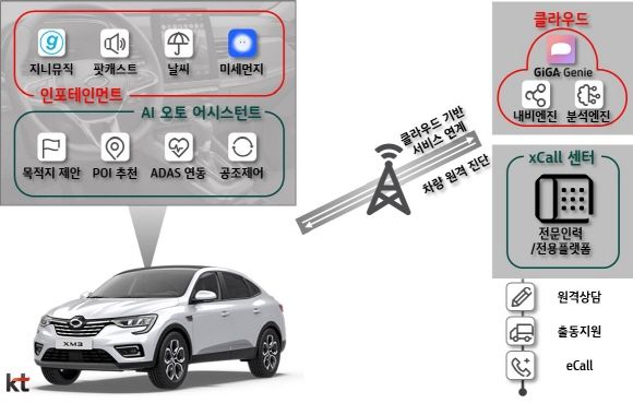 KT는 하반기 르노삼성이 출시하는 차량에 'AI 오토 어시스턴트' 서비스를 제공할 계획이다. 이 서비스는 사용자의 일과에 맞춰 목적지를 제안하고 차량 상태에 따라 주유소나 정비소를 추천해 준다. 주행상태나 교통상황을 고려한 주행보조시스템 추천, 차량 내 온도·습도·공기질 실시간 모니터링 및 환기 기능도 제공한다.