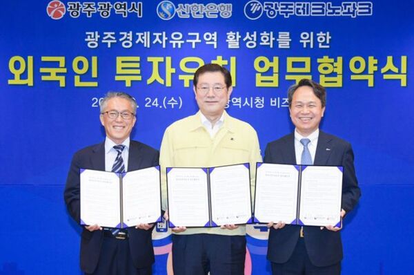 신한은행은 광주광역시, 광주테크노파크와 광주시 외국인투자유치 활성화를 위한 상호 전략적 파트너쉽을 구축하는 3자간 업무협약을 체결했다고 25일 밝혔다.