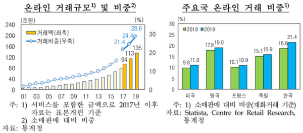 한은은 "온라인 거래 확대는 상대적으로 가격이 낮고 가격조정이 빈번한 온라인 구매가 늘어나는 효과를 통해 물가에 하방압력을 주고 변동성을 높이는 요인으로 작용할 가능성이 있다"며 "이는 오프라인 가격 신축성도 높여 물가의 거시충격에 대한 민감도를 높일 가능성이 있다"고 내다봤다.
