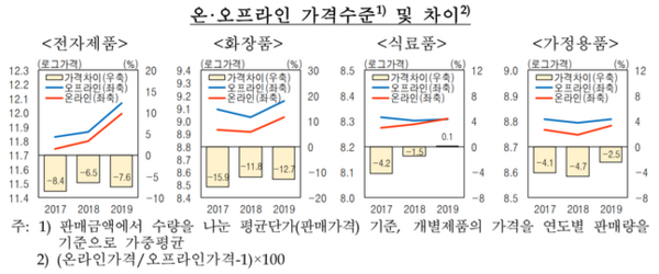 한은은 "매칭가능한 제품을 대상으로 분석한 결과 온라인 가격이 전반적으로 오프라인에 비해 낮은 가운데, 가격조정도 더 빈번한 것으로 나타났다"고 밝혔다. 온라인에서 판매하는 제품가격이 더 낮은데다, 경쟁을 통해 가격인하도 더 빈번하게 나타난다는 설명이다.