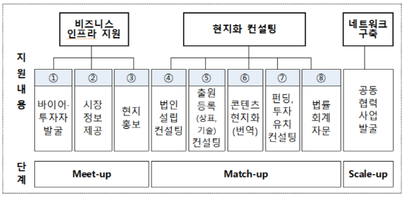 미국, 베트남, 싱가포르, 인도 진출을 희망하는 기업은 현지 기업지원 거점(5개소)을 통해 현지 시장 정보, 바이어·투자자 발굴, 법률·회계자문, 법인설립 등 현지 진출을 위한 상시적인 지원을 받을 수 있다. 이외에도 상시적인 해외 홍보를 위해 유튜브에 'Korea Digital Content TV'를 신규 개설했다.
