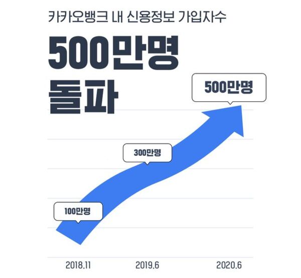 카카오뱅크가 2018년 10월 제1금융권에서는 최초로 출시한 ‘내 신용정보’ 서비스는 매월 평균 25만명이 가입해, 20개월만에 500만명의 가입자를 확보했다.
