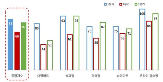 대형마트는 방문객 급감과 더불어 매출 대부분을 차지하는 식품 및 생필품마저 온라인에 내주며 지난 2분기 역대 최저 전망치(44)를 기록했다.