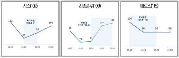역대 전염병 확산으로 인한 국내 소매유통업 전망추이를 살펴보면 사스(2002)와 신종플루(2009)는 최저점을 찍은 후 두 번째 분기에 반등(100이상)에 성공했다. 반면 메르스(2015)는 낙폭 이후 반등에 실패하고 줄곧 부정적 전망이 이어지는 추세로 고착화됐다.