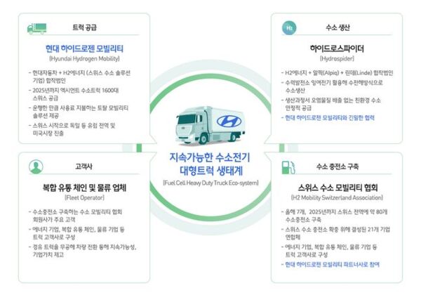 먼저 수소전기트럭 공급사인 현대 하이드로젠 모빌리티는 지난해 스위스 내 수소충전소 구축을 목적으로 총 21개의 글로벌 에너지사와 물류기업이 연합해 설립한 ‘스위스 수소 모빌리티 협회(H2 Mobility Switzerland Association)’에 파트너사로 참여하면서 수소 충전 부문과 전략적 협력관계를 맺었다.