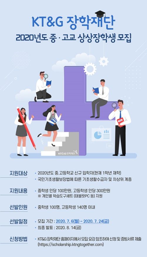 KT&G장학재단은 코로나19 장기화로 경제적 어려움을 겪고 있는 중·고교생을 지원하기 위해 '2020년도 중·고교 상상장학생'을 모집한다고 6일 밝혔다.