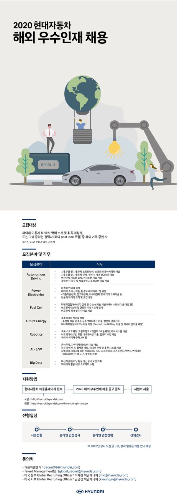 ‘2020 현대차 해외 우수인재 채용’ 모집 분야는 △자율 주행(Autonomous Driving) △전력 전자(Power Electronics) △연료 전지(Fuel Cell) △미래 에너지(Future Energy) △로보틱스(Robotics) △인공지능ᆞ소프트웨어(AI · S/W) △빅 데이터(Big Data) 등 총 7개이다.