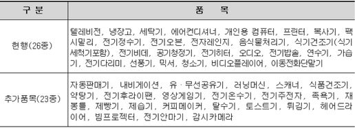 환경부는 의무대상자의 제도 수용성과 국민건강·환경에 대한 영향을 고려해 제한 필요성이 높은 전기·전자제품 23개 품목을 개정 대상에 포함했다.