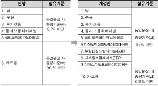 개정안에 따라 전기·전자제품 제조·수입업자는 제품 제조단계에서 유해물질 함유기준(동일물질 내 중량기준 0.1% 미만)을 준수해 제조하거나 수입해야 한다.