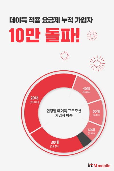 데이득 프로모션은 KT 엠모바일 고용량 데이터 요금제의 기존 가입자 및 신규 고객에게 1년간 최대 100GB 추가 데이터를 제공하는 이벤트로 오는 15일 종료된다. 지난 4월부터 6월까지 요금제 3종 신규 가입자는 전년동기대비 160% 늘어났다.