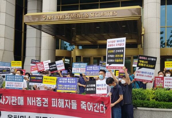 피켓에는 '금감원은 옵티머스 판매사인 NH투자증권을 시장에서 퇴출하라', '사기당한 NH투자증권, 금융회사 자격 없다!', '옵티머스 사기행각 판매사도 피해자라니, 검찰은 NH투자증권 철저하게 수사하라', '피해자 코스프레 엽겹구나 그만해라' 등 투자자들의 원성이 담겼다.