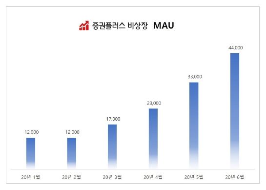 증권플러스 비상장의 MAU는 올 초 1만명 대 수준이었으나 4월, 2만명대로 올라섰다가 6월에는 4만4000명으로 급성장했다. 신규 가입자도 꾸준히 늘어 20일 현재 기준 누적 가입자 10만 명을 넘어섰다. 증권플러스 비상장에서 거래 가능한 비상장 종목은 총 4660개, 거래 희망 게시글은 4만1122개, 거래 완료 게시글은 9179건에 달한다.