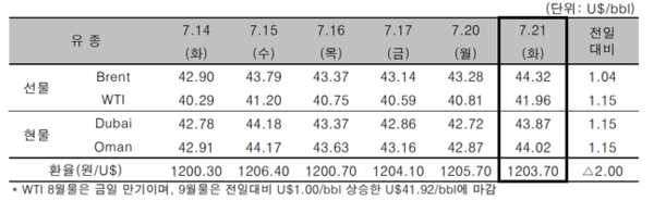 22일 한국석유공사에 따르면 21일(현지시간) 뉴욕상업거래소(NYMEX)의 미국 서부텍사스산원유(WTI)는 전일 대비 배럴당 1.15 달러 뛴 41.96 달러로 마감했다.
