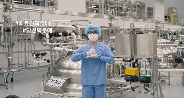 삼성바이오로직스가 22일 코로나 확산 방지를 위해 헌신하는 의료진과 소방대원에게 감사와 응원의 마음을 전하는 '#덕분에 챌린지'에 동참했다. ▶ 삼성바이오로직스가 코로나 확산 방지에 헌신하는 의료진과 소방대원에게 감사와 응원의 마음을 전하는 #덕분에 챌린지에 참여했다. 삼성바이오로직스의 직원들이 바이오파크에서 존경을 의미하는 수어를 하는 모습ⓒ ▶ 삼성바이오로직스가 코로나 확산 방지에 헌신하는 의료진과 소방대원에게 감사와 응원의 마음을 전하는 #덕분에 챌린지에 참여했다. 한 직원이 인천 송도 2공장에서 존경을 의미하는 수어를 하는 모습 ⓒ