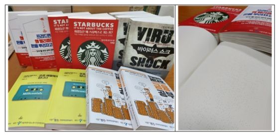 이번에 제작된 점자도서는 △바이러스 쇼크 △오늘부터 제대로 금융공부 △요즘 애들에게 팝니다 △사람들은 왜 스타벅스로 가는가 △프리더먼은 왜 헬리콥터로 돈을 뿌리자고 했을까 등 총 5종 11권이다.