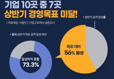 구인구직 매칭 플랫폼 사람인(saramin·대표 김용환)이 236개사를 대상으로 ‘올해 상반기 목표 실적 달성 여부’를 조사한 결과 73.3%가 ‘달성하지 못했다’고 답했다.