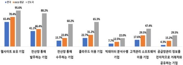 하지만 기업의 ICT 활용도 측면에서는 OECD 평균 이하로 나타났다. 한국 기업들은 인터넷을 통한 거래와,고객관리 및 공급망 관리 분야에서 ICT 기술을 이용하는 기업 비율이 OECD 평균보다 낮았다.